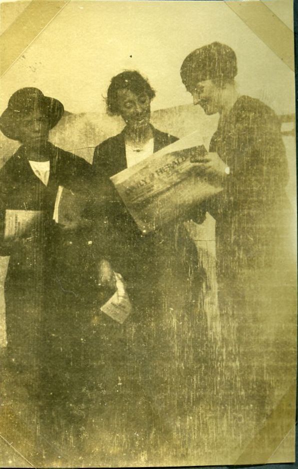 Scope and ContentInformal photograph of three women looking at the Daily Herald, possibly on the roof of Dilke House, Malet Street, London