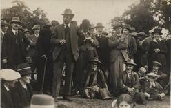 Scope and ContentBlank postcard of a group, including BJ, FJ and Manningsley, listening to RC Wallhead speaking
