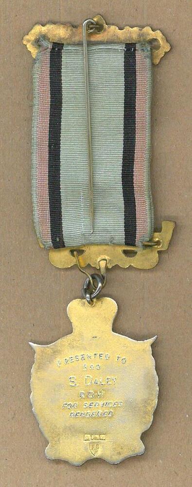 Scope and ContentJewel with pale blue ribbon with Dunnico Lodge No 6665 Lodge and services rendered pendant engraved on the back with "Presented to Bro. S. Daley ROH for services rendered"