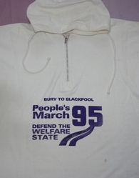 Scope and ContentCream hoodie with "Bury to Blackpool People's March 95, Defend the welfare state" in purple lettering on front and back