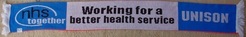 Scope and ContentWoollen scarf - Side one: Blue and white with "NHS together" and "UNISON" in the blue sections and "Working for a better health service" in the white section. Side two: Red with "UNISON Keep the NHS working" in black and white ltettering