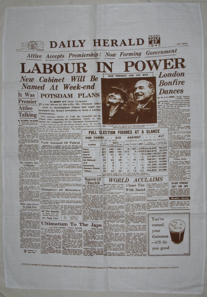 Scope and ContentTea-towel showing the front page of the Daily Herald for 27 July 1945