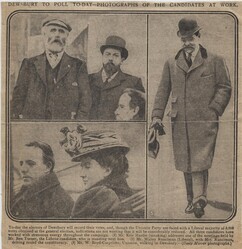Scope and ContentNewspaper clipping entitled "Dewsbury to Poll To-day - Photographs of the Candidates at Work". The clipping has three photographs. 1 - Keir Hardie addressing a meeting with Ben Turner (candidate); 2 - Walter Runciman and his wife; 3 - W Boyd Carpenter. Although not dated, the Labour Candidate Ben Turner stood for Dewsbury in the general election of 1906 and in a by-election of 1908, from text would seem that it is the 1908 contest.