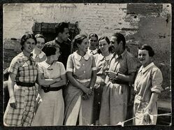 Scope and ContentInformal group photograph of 7 women and 2 men. The text on the back reads "Nurses and Spanish Doctor, Aragon Front". Scottish nurse Annie Murray (1906-1997) is centre front row and Lancashire nurse Mary Slater is front row 2nd left. Also in the photograph are Welsh nurse Margaret Powell (1913-1990) and Patience Edney (1911-1996)