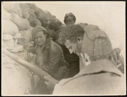 Scope and ContentPhotograph of Sam Masters, with rifle, facing him Nat Cohen, and Ramona Siles Garcia, later Ramona Cohen, in the trenches probably on the Aragon Front. 8 press cuttings and two articles relating to the photograph in EVT/SPAIN/3/9/27