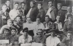 Scope and ContentCopy of a formal portrait of a group of wounded men. Top row from left: 3. Pat Curry (Bootle), 6. Joe Garber (London)?, 7. Bert Overton (Stockport), 9. James McLennan (Greenock). 2nd row from left: 1. with bandage under chin Andre Diamont (Cairo/London), 6. with hand in sling, Jimmy Allen (Liverpool). Front row from left: 1. Mick Johnson (Liverpool), 2. Walter Gregory (Nottingham), 4. Paddy Power (Waterford), 5. George Buck? 6. George (or Bill?) Rowe (London).