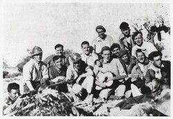 Scope and ContentCopy of an informal photograph of a group of men, one with a guitar. Identified men are: 2nd left Tommy Smith of Liverpool (dark hair striped top) with the guitar, William Robert 'Digger' Wallace of Birkenhead, 2nd from right with clenched fist, Bobby Walker, from Scotland, and Mick Johnson (arm around Bobby, wearing a beret), from Liverpool.