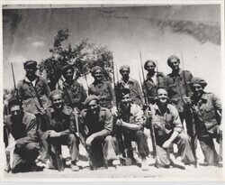 Scope and ContentCopy of a formal outdoor portrait of a group of 12 men holding rifles. Left-right front row Paddy Smith (Dublin), Peter O'Connor (Waterford), J Bourke (Liverpool-Irish), Paddy Power (Waterford), his brother Johnnie, Michael Kelly (Ballinasloe). Back row 2nd from left Thomas T O'Brien (Dublin and Liverpool), killed at Jarama, 3rd left, Joe Rehill (Irish-American), 5th left J Pickards (Canada), extreme right Steve Troxil (New York). [Details taken from M O'Riordan, Connolly Column (1979), plates between pp128-129]