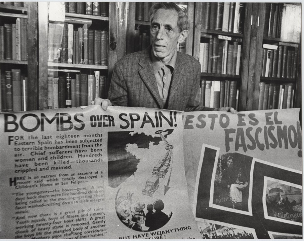 Scope and ContentPhotograph of Eddie Frow in front of bookcases, holding two Spanish Civil War posters. Probably take in 111 Kings Road, Old Trafford. On back it has a Manchester Evening News stamp.