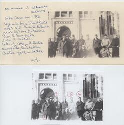 Scope and ContentCopy of a photograph of a group of men outside a building taken by Ralph Cantor, with a description by ML. 1. George Westfield from Liverpool 2. Bill Benson, from Stretford, Manchester 3. Maurice Levine from Altrincham 4. Eddie Swindells, from Rusholme, Manchester, 5. Julius 'Jud' Colman, from Cheetham Hill, Manchester.