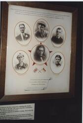 Scope and ContentPhotograph of an exhibit in an Oldham Library exhibition entitled "The Oldham men who Fought in Spain 1936-1938", at Oldham Local Interest Centre 29 January-24-May 1986: Framed print of portraits from left to right Kenneth Bradbury, Clem Beckett, Clifford Wolstencroft, William Jackson, Joseph Maynard Lees and in the centre Harry Roland Heap