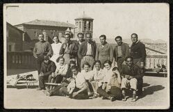 Scope and ContentPostcard showing a formal outdoor group of people. A note on the back reads "The Aragon Front 1937". Nurse on the back row is Susan Sutor, front row from the left, Scottish Nurse Annie Murray, 3rd Australian Agnes Hodgson, and on extreme right welsh nurse Margaret Powell, the little dog is called Tom, as is evidenced in Agnes Hodgson's diary which was published with the title, Last Mile to Huesca.