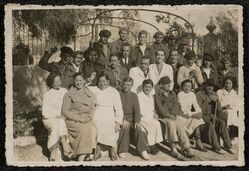 Scope and ContentFormal outdoor photograph of a large group of men and women. Some are dressed as doctors and nurses. Sam Wild is second from the right of middle row.