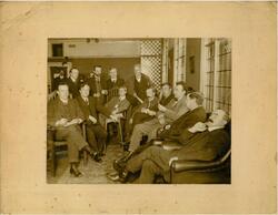 Scope and ContentPhotograph of a group of men in the Clarion Cafe, Manchester. They are AA Purcell, Ben Tillett, Harry Boswick, [...] O'Donnell, Jim Larkin, Bob Williams, Bill Haywood, Jim Connelly, [...] Willcocks, [...] Sharply, Harry Pearce, Tom Forsyth, R Manson
