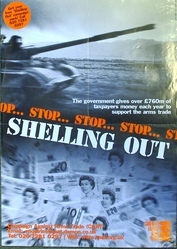 Scope and ContentPoster with an image of a tank and an image of bank notes and the text: Stop... Stop... Stop... Shelling out. The government gives over £760m of taxpayers money each year to support the arms trade