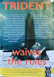 Scope and ContentPoster with an image of a submarine and the text: Trident waives the rules. Dangerous, provocative, wasteful, a black hole for taxpayers' money, a massive escalation in nuclear proliferation, each warhead seven times more powerful than the Hiroshima bomb, murderous, barbaric, declared illegal by the International Court of Justice, opposed by Generals and Admirals, aggressive, hypocritical, arrogant, a post-imperial delusion, nationalistic nonsense, imposed on the Scottish people against their will, environmentally harmful, radioactive, the pinnacle of violence in a violent society, irrelevant to the world's problems, ugly, obscence, apocalyptic, bullying, sercret, anti-democratic, destablising, a Cold War relic, a white elephant, appalling, explosive, an accident waiting to happen, enough power to set off an nuclear winter, trafficking nuclear warheads around our roads, prevents progress in disarmament, undermines the Non-Proliferation Treaty, criticised in the press, resisted by Faslane Peace Camp, a political opportunity waiting for the party hat has the will and courage to scrap it, illegal, immoral, expensive, useless, a challenge to all of us to do everything we can to get rid of it. The British government spends £1.5 bilion every year on Trident, its submarine-based nuclear weapons system. the Trident submarines are based at Faslane, 30 miles from Glasgow. You can help get rid of Trident. Join the Campaign for Nuclear Disarmament