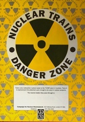 Scope and ContentPoster with the text: Nuclear trains. Danger zone. Trains carry radioactive nuclear waste to the THORP plant in Cumbria. There is is reprocessed into plutonium pure enough to be used in nuclear weapons. The nearest station they pass through is: