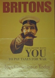 Scope and ContentPoster with an image of Lord Kitchener and the text: Britons - your country wants you to pay taxes for war. Join Conscience today. Campaign for the right not to pay for war!