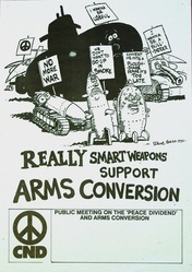 Scope and ContentPoster with a cartoon of protesting nuclear weapons and the text: Really smart weapons support arms conversion. Public meeting on the Peace dividend and arms conversion [with blank space for meeting details]