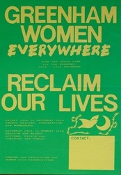 Scope and ContentPoster with the text: Greenham women everywhere. Join the Peace Camp for the weekend: 12-14th December. Reclaim our lives. Friday 12th to Saturday 13th - Energy raising, preparation and workshops. Saturday 13th to Sunday 14th - Reclaim the night! Actions, vigils and confront the fence!.