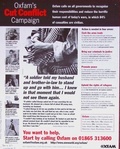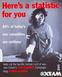 Scope and ContentDouble sided poster with an image of a wounded woman and the text: Here's a statistic for you. 84% of today's casualties are civilians. Help cut the horrific human cost of war. Join Oxfam's Cut Conflict Campaign with details of the campaign on the other side