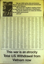 Scope and ContentPoster with an image of a soldier and the text: "We are 1,366 active-duty servicemen. We are opposed to the American involvement in the war in Vietnam. We resent the needless wasting of lives to save face for the politicians in Washington. We speak, believing our views are shared by our fellow servicemen. Join us" [followed by the signatories]. This war is an atrocity. Total US withdrawl from Vietnam now