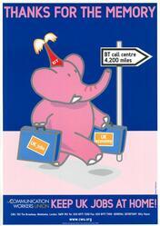 Scope and ContentPoster with an image of a BT elephant carring cases marked UK jobs and UK economy with a sign reading BT call centre 4,200 miles and the text: Thanks for the memory. Communication Workers Union. Keep UK jobs at home!