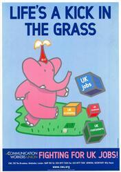 Scope and ContentPoster with an image of a BT elephant kicking boxes labelled UK jobs, UK economy, UK revenues and UK customers and the text: Life's a kick in the grass. Communication Workers Union. Fighting for UK jobs!