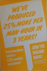 Scope and ContentPoster with the text: We've produced 25% more per man-hour in 3 years! Farmworkers need a £25 weekly minimum! Join the NUAAW now!