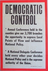 Scope and ContentPoster headed Democratic control with the text: Annual conferences held in the counties give our 3,700 branches the opportunity to express Local Points of View and influence National Policy. A National Delegate Conference held every other year decides National Policy and is the supreme authority of the Union.