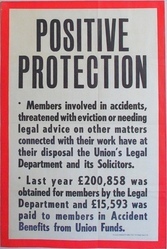 Scope and ContentPoster headed Positive protection and with the text: Members involved in accidents, threatened with eviction or needing legal advice on toher matters connected with their work have at their disposal the Union's Legal Department and its Solicitors. Last year £200,858 was obtained for members by the Legal Department and £15,593 was paid to members in Accident Benefits from Union Funds.