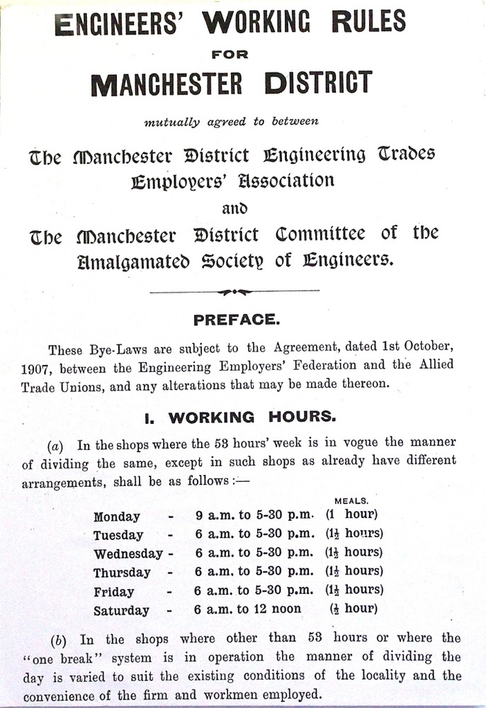 Scope and ContentCopy of engineers' working rules for Manchester District agreed between the Manchester District Engineering Trades Employers' Association and the Manchester District Committee of Amalgamated Society of Engineers.