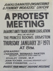 Scope and ContentPoster advertising a protest meeting against anti trade union legislation at the Princess Rooms, Urmston on 21 Jan 1971. The speakers were Bernard Panter, Stanley Orme, John Tocher and John Forrester