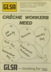 Scope and ContentPoster with an image of a child holidng a number of ballons labelled Job security; Pensions; Holiday pay; Sick pay; Guaranteed pay; Employment protection and the text; GLSA. Creche workers needed. GLSA - working for you. Produced by Greater London Staff Association.