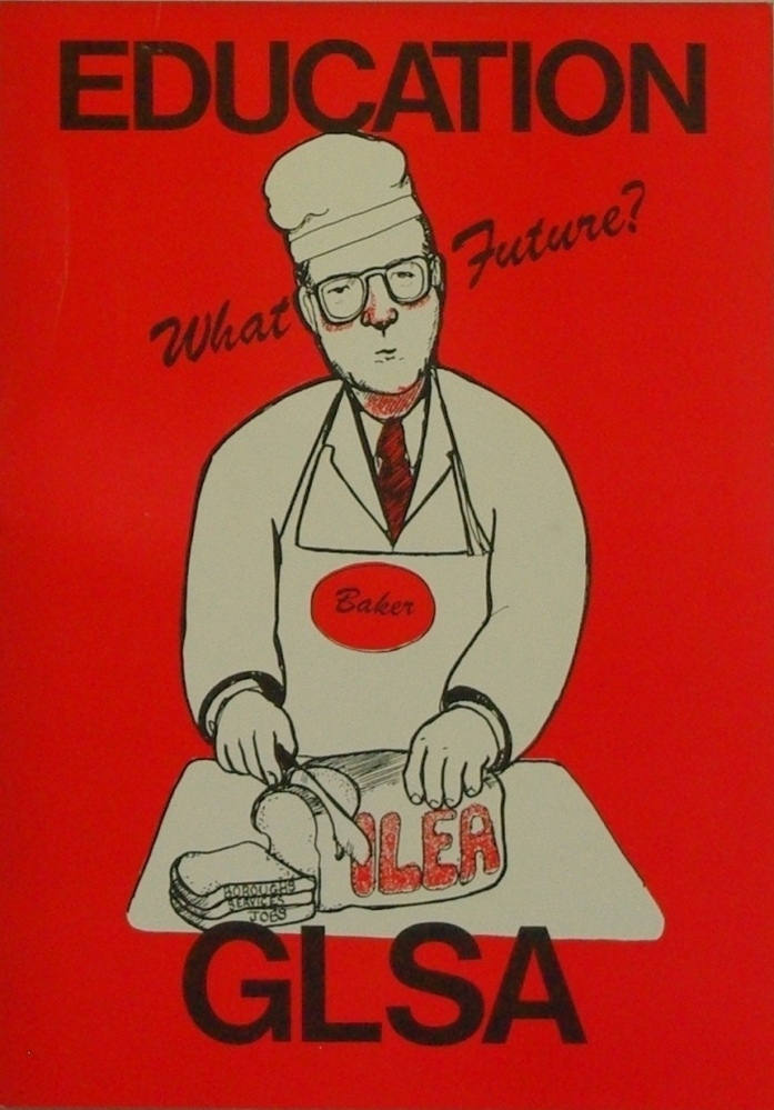 Scope and ContentPoster with an image of [Kenneth] Baker slicing a loaf of bread labelled ILEA and the text: Education. What future?. GLSA