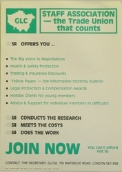 Scope and ContentPoster with the text: GLC staff association - the trade union that counts. GLCSA offers you ... The big voice in negotiations; Health and safety protection; Trading and insurance discounts; Yellow Pages - the informative monthly bulletin; Legal protection and compensation awards; Holiday grants for young members; Advice and support for individual members in difficulty. GLCSA conducts the research. GLCSA meets the costs. GLCSA does the work. Join now - you can't afford not to.