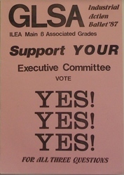 Scope and ContentPoster with the text: GLSA industrial action ballot '87. ILEA main B associated grades. Support your Executive Committee. Vote yes! yes! yes! for all three questions