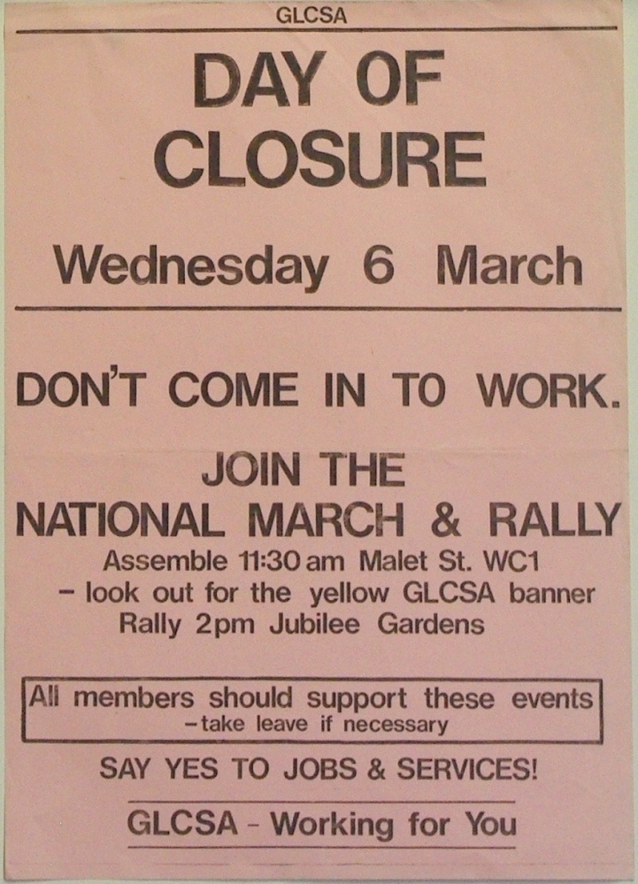 Scope and ContentPoster detailing a day of closure on Wed 6 Mar [no year] and a national march and rally at Jubilee Gardens, London.