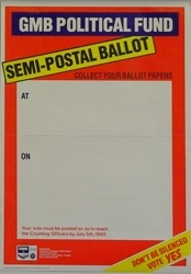 Scope and ContentBlank poster headed GMB Political Fund semi-postal ballot showing when and where the GMB political fund ballot papers can be collected