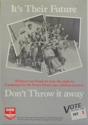 Scope and ContentPoster with a photograph of a group of children and a Lollipop lady with the text: It's their future. Without our fund we lose the right to campaign for the better future our chiclren deserve. Don't throw it away. Vote political fund yes.