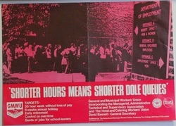 Scope and ContentPoster with an image of a dole queue and the text: Shorter hours means shorter dole queues. Targets: 35 hours week without loss of pay. 6 weeks annual holiday. Early retirement. Control on overtime. Quota of jobs for school-leavers. with more detail of the targets on the reverse. Published by the GMWU.