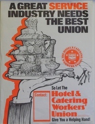 Scope and ContentPoster with an image of a hand holding a tray of food aloft and the text: A great service industry needs the best union, so let the Hotel and Catering Workers' Union (part of the General ans Municipal Workers' Union) give you a helping hand. Produced by the GMWU.