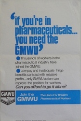 Scope and ContentPoster with the text: If you're in pharmaceuticals ... you need the GMWU. Thousands of workers in the pharmaceutical industry have joined the GMWU. Low pay and inadequate fringe benefits contrast with massive profits - only GMWU action can improve the position for workers. Can you afford to go it alone? Join the GMWU The Union for Britain's pharmaceutical workers.