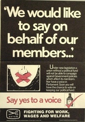 Scope and ContentPoster with an image of a mouth with tape over it and the text: We would like to say on behalf of our members ... Under new legislation a union without a political fund will not be able to campaign against Government policies which afftect its members. Nor have a voice in Parliament. Soon you will have the chance to vote on keeping our political fund. Say yes to a voice. NUTGW. Fighting for work, wages and welfare.