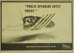 Scope and ContentPoster with a photograph of cockroach sitting on a fork which is resting on a plate and the text: Public spending cuts? Yummy. Public spending cuts threaten public health. Use your vote.