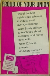 Scope and ContentPoster headed Proud of your union with an image of a woman holding a placard on which is written: One of the best holiday pay schemes in industry - at average earnings. Work Study Officers to teach you about incentive and bonus payments. Now 42 hours a week. 40 hours - when?