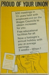 Scope and ContentPoster headed Proud of your union with an image of a woman holding a placard on which is written: 500 meetings in 10 years held with employers on the Wages Councils to obtain increases for you. Free educational facilities for all. Now a fortnight's annual holiday with pay at average earnings. 3 weeks - when?