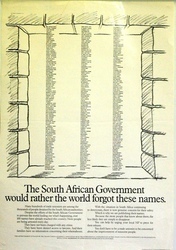 Scope and ContentPoster with an image of the names of detained trade unionists forming the bars of a cell and the text: The South African government would rather the world forgot these names. Many hundreds of trade unionists are among the thousands of people detained by the South African authorities. Despite the efforts of the South African Government to prevent the world finding out what's happening, over 100 names have alread reached this country. More people are being arrested every day. They have not been charged with any crime. They have been denied access to lawyers. And their families have no information concerning their whereabouts. With the situation in South Africa continuing to deteriorate, there is now a genuine concern for their safety. Which is why we are publising their names. Because the more people that know about them, the less likely they are to simply disappear. You can help by urging your local MP to press for their release. You don't have to be a trade unionist to be concerned about the imprisonment of innocent people