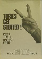 Scope and ContentPoster with a photograph of a hand giving a V-sign and the text: Tories get stuffed! - Keep trade unions free. This is a Challenge poster