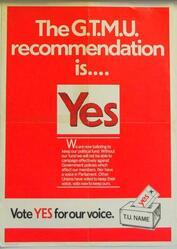 Scope and ContentSample political fund ballot poster with the text: The GMTU recommendation is ... Yes. We are now balloting to keep our political fund. Without our fund we will not be able to campaign effectively against Government policies which affect our members. Nor have a voice in Parliament. Other unions have voted to keep their voice, vote now to keep ours. Vote Yes for our voice
